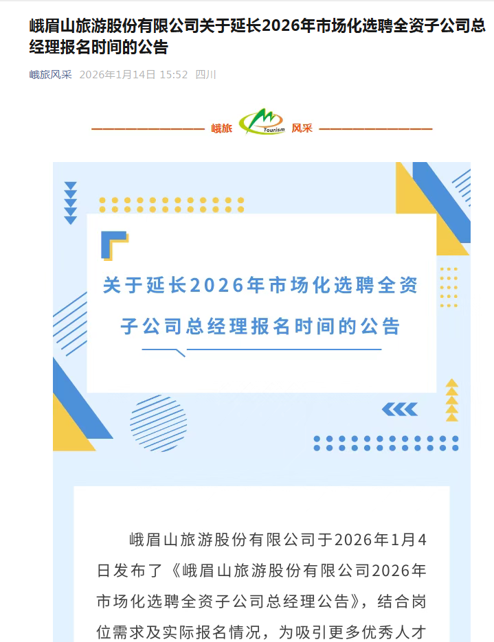 来自峨眉山旅游股份有限公司的消息显示,峨眉山旅游股份有限公司近日发布《关于延长2026年市场化选聘全资子公司总经理报名时间的公告》(以下简称《公告》)。《公告》称,峨眉山旅游股份有限公司于2026年1月4日发布了《峨眉山旅游股份有限公司2026年市场化选聘全资子公司总经理公告》,结合岗位需求及实际报名情况,为吸引更多优秀人才关注并参与应聘,经公司研究,决定延长本次市场化选聘全资子公司总经理报名时间——报名时间延长至2026年1月20日18:00。