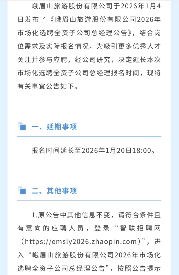 峨眉山旅游股份有限公司强调,原公告中其他信息不变,请符合条件且有意向的应聘人员,登录“智联招聘网”,进入“峨眉山旅游股份有限公司2026年市场化选聘全资子公司总经理公告”,按照公告提示完成报名。已在原报名时段内提交报名材料的人员,无需重复报名,后续审核流程按原公告内容进行。